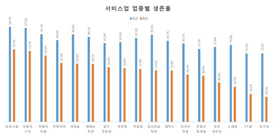 "광산구, ‘외식업 업종지도’에 이어 ‘서비스업 업종지도’발표" [아시아경제 노해섭 ]광주시 광산구에서 창업한 후 3년 넘은 서비스업 가운데 보육시설, 자동차수리점, 자동차미용점 순서로 생존율이 높은 것으로 나타났다.광주시 광산구(구청장 민형배)가 14일 '2013년 기준 사업체조사’자료를 바탕으로 ‘자영업자 업종지도 서비스업’편을 발표했다. 창업을 생각하고 있는 예비자영업자 등에게 도움을 주기위해 6월 초 발표한 ‘외식업체’편에 이어 광산구 서비스업 19종을 분석한 결과를 추가로 발표한 것. 창업 후 3년 보육시설은 75.3%, 자동차수리점은 73.5%, 세차·선팅 등 자동차미용점은 68.9%의 생존율을 보였다. 반면 창업 1~3년 사이 급격한 생존율 하락을 보인 업종도 있었다. 당구장(71.2%→26.1%), PC방(71.1%→29.1%), 노래방(79.9%→36.5%) 등이었다.아울러 보육시설, 인테리어점 등은 사업체 규모에 따라 생존율 차이가 두드러졌다. 고용 1~4명으로 소규모인 경우 창업 3년 후 보육시설은 전체 생존율 보다 15.4%p, 인테리어점은 15.0%p 더 낮았다. 광산구 서비스업 중 사업체 수가 많은 업종은 미용실로 652개. 예체능학원 548개, 입시보습학원 520개, 부동산중개업 487개가 그 뒤를 이었다. 특히, 노인요양시설과 네일숍은 2007~2013년 사이 각각 64.1, 59.7%의 연평균 성장률을 기록했다. 반대로 PC방은 같은 기간 ?3.4% 성장률을 보였다. 서비스업 사업체 대부분은 수완·첨단2동 등에 집중돼 있어 외식업종과 마찬가지로 인구수와 업체의 비례관계가 확인됐다. 나아가 송정2동은 여관업, 운남동은 입시보습학원과 예체능학원, 비아동에는 골프연습장과 자동차수리점, 우산동에는 노래방과 PC방 및 당구장이 밀집해 있어 동별 업종 분포 차이도 뚜렷했다. 광산구 관계자는 “매년 정부에서 발표하는 사업체조사 자료를 활용해 다양하고 유익한 업종지도를 더욱 확대 생산하겠다”며 “예비창업자들의 합리적인 선택에 조금이나마 도움이 되길 바란다”고 밝혔다. 광산구는 서비스업 업종지도를 광산구 공공데이터 정거장인 imap.gwangsan.go.kr에 올려 누구나 쉽게 내용을 확인해 볼 수 있도록 서비스하고 있다. 편의점·약국·옷가게 등 ‘도·소매업’자영업자 업종지도를 준비 중이다. 노해섭 기자 nogary@<ⓒ세계를 보는 창 경제를 보는 눈, 아시아경제(www.asiae.co.kr) 무단전재 배포금지>