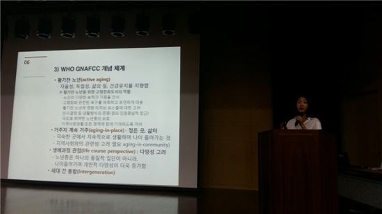 정은하 서울시복지재단 연구개발실 연구위원이 15일 성남 고령친화종합체험관에서 열린 제4회 K-시니어비즈넷 조찬포럼에서 '고령화가 도시를 바꾼다'를 주제로 발표하고 있다.