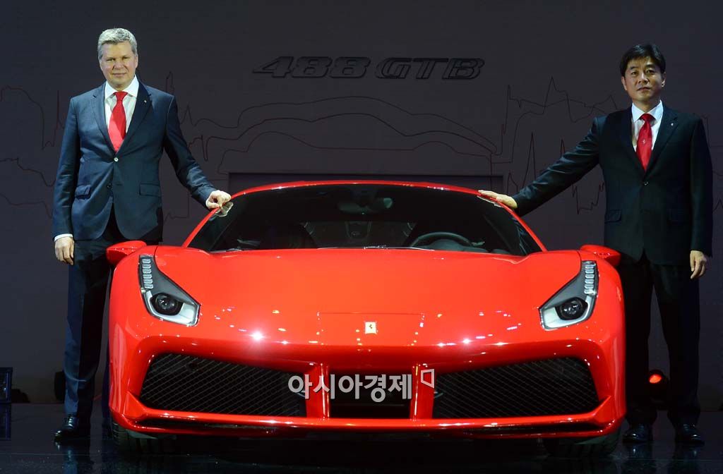 [아시아경제 백소아 기자] 16일 서울 서초구 세빛섬에서 페라리 488 GTB 국내 공식 출시 행사에서 디터 넥텔 페라리 극동지역 총괄 지사장(왼쪽)과 엄진환 FMK페라리 총괄 전무가 포즈를 취하고 있다. 488 GTB는 8기통 미드리어 엔진을 탑재한 모델로 동급 최강의 성능과 빠른 응답속도를 자랑한다. 최고출력은 670/8000(hp/rpm), 최대토크는 77.5/3000(kg.m/rpm)를 기록한다.백소아 기자 sharp2046@asiae.co.kr<ⓒ세계를 보는 창 경제를 보는 눈, 아시아경제(www.asiae.co.kr) 무단전재 배포금지>