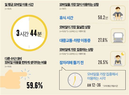 [아시아경제 강희종 기자]#대학생 유모양은 눈을 뜨자마자 머리맡의 핸드폰을 찾는다. 지난 밤에 온 친구들의 카카오톡을 확인하고, 네이버에 오늘의 날씨를 검색해보기 위해서다.학교 수업을 들으면서도 연신 카카오톡과 페이스북을 확인하고, 식사 중에는 친구가 공유한 동영상이나 짤방을 보며, 자기 전엔 침대에 누워 새로 올라온 웹툰을 읽는다. 눈을 뜨는 순간부터 잠들기 전까지 핸드폰을 손에서 놓지 않는 것이다. 이런 20대의 일 평균 모바일 이용시간은 3시간 44분(223.6분)으로 나타났다. 잠자는 시간(20대 일 평균 수면시간 7시간 2분)을 제외하면 하루의 1/5(21.9%)을 모바일 화면을 보며 보내는 셈이다.대학내일20대연구소는 KT경제경영연구소와의 공동으로 전국 20대 남녀 918명을 대상으로 실시한 설문조사를 바탕으로 '2015년 20대 모바일 및 콘텐츠 이용실태조사' 보고서를 17일 발표했다.하루 동안 모바일을 사용하는 상황에 따라 조사해 본 결과, 휴식시간(일 평균 50.2분)에 모바일을 가장 많이 이용했다.모바일이 가장 절실하게 필요하다고 느끼는 순간은 대중교통/차량 이용 시(27.6%)라고 응답했다. 그러나 가장 집중해서 이용하는 시간은 잠자리에 들기 전(26.5%)이었다. 20대의 평균 취침 시각(밤 12시 36분)을 고려하면, 밤 12시에서 새벽 1시 사이에 모바일을 가장 집중해서 이용할 것으로 보인다.20대 모바일 코넨츠 이용 행태 분석(자료:대학내일20대연구소)