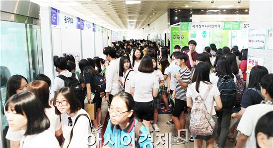 "17~18일 이틀간 전국 고교생 5,500여 명 몰려 대성황"[아시아경제 노해섭 기자]지난 주말 전남대학교 교정은 전국에서 온 중·고교생들의 ‘꿈 찾기’열정으로 뜨겁게 달아올랐다.전남대학교(총장 지병문)는 7월17일과 18일 대학본부(1층 로비)와 용지관 컨벤션홀 등에서 고교생들에게 미래의 꿈을 찾아주고 진학과 진로상담을 해주는 '2015진로·진학박람회’를 열었다.무더운 날씨에도 불구하고 이틀 동안 박람회장을 찾은 중·고교생과 학부모·교사가 5,500여 명에 이를 정도로 열띤 분위기를 연출했다. 지난해 3,300여 명이 찾았던 것에 비해 방문객수가 66% 이상 는 것이다. ‘공교육 안에서 꿈을 찾는 진로-진학 캠퍼스(Campus)’라는 주제로 진행된 이번 박람회에서 전남대학교는 전국의 고등학생과 교사, 학부모들에게 전공 상담 및 체험, 진학특강 등 다양한 프로그램을 제공했다. 학생들은 16개 단과대학, 80개 학과·학부·전공 별로 설치된 부스에서 대학생 누나와 형, 언니들로부터 전공·진로선택과 관련한 조언 및 경험담을 들으면서 자신의 미래를 설계했다. 또 물리·화학·생물·지구과학 등 자연과학 계열 학과들이 제공하는 과학실험과 공학계열 학과들이 꾸민 전시프로그램 등을 관람하면서 자신이 진학할 전공에 대한 탐색의 시간을 가졌다.사전·현장 접수를 통해 진행한 2016학년도 학생부위주 전형 면접대비전략, 학부모를 위한 진로·진학특강, 학생부작성 내실화 교사 연수 프로그램 등에도 학생과 학부모, 교사 1,000여 명이 참여하는 등 높은 관심도를 보여줬다.친구들과 함께 박람회장을 찾은 순천 강남여고 2학년 문지수 양은 “대학생 오빠 ·언니들이 친절하게 상담을 해줘 전공 및 진로 선택에 많은 도움이 됐다”고 만족감을 나타냈다.대전에서 온 오현(남대전고·2년) 군은 “말로만 듣던 대학교에 직접 와서 형·누나들로부터 대학생활에 대해 도움 되는 실감나는 얘기를 많이 들을 수 있어 좋았다”면서 “학과선택과 장래 진로를 결정하는 데도 많은 도움이 될 것 같다”고 말했다. 지병문 전남대학교 총장은 “중·고등학교때 자신의 진로와 전공 선택에 대한 확실한 방향을 설정하는 것은 인생의 성공을 위해 매우 중요한 요소”라면서 “이번 박람회가 청소년들에게 꿈을 설계할 수 있는 좋은 기회가 되길 바란다”고 말했다.노해섭 기자 nogary@<ⓒ세계를 보는 창 경제를 보는 눈, 아시아경제(www.asiae.co.kr) 무단전재 배포금지>