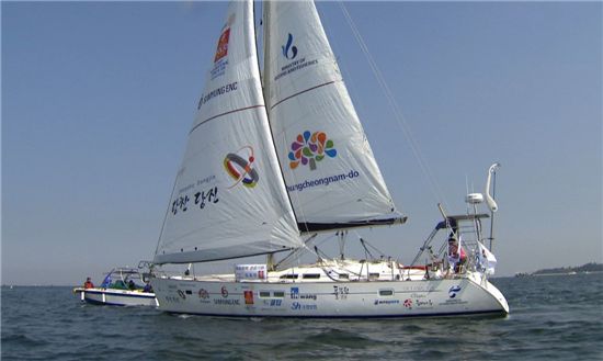 충남 당진 왜목항 앞 바다. 무동력, 무지원으로 세계일주에 성공한 김승진 선장의 요트 등이 떠있다.