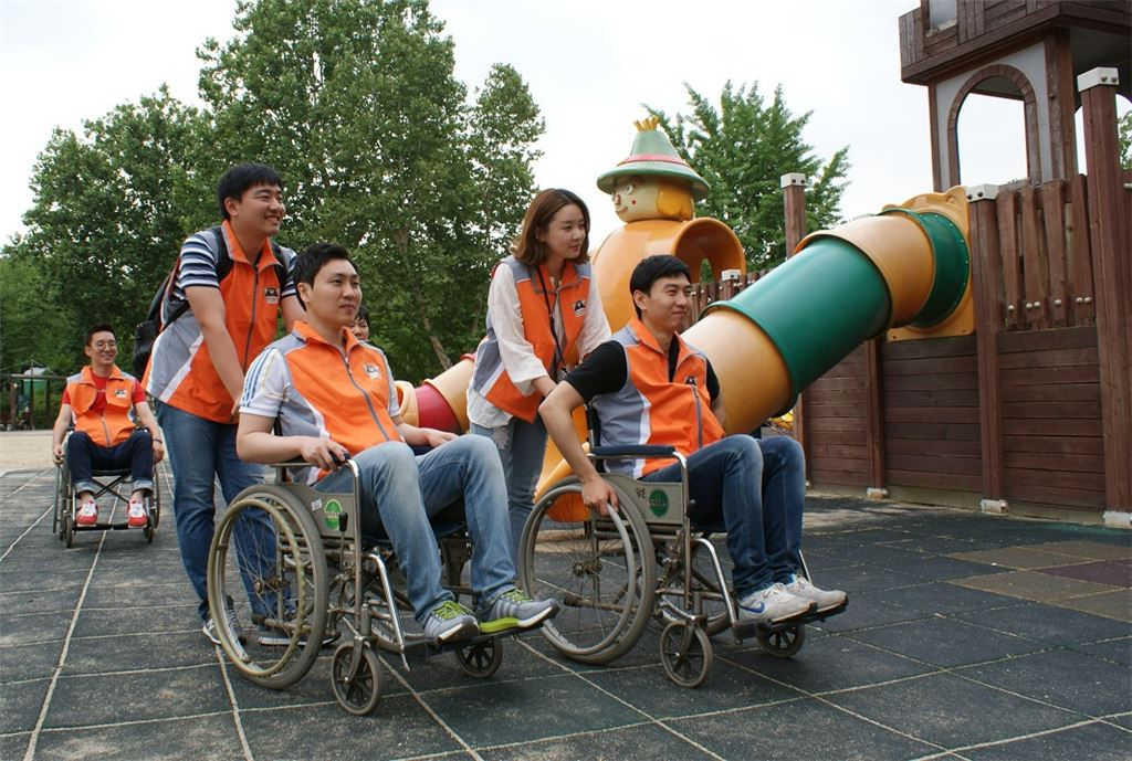 대웅제약 임직원들이 서울어린이대공원에 들어설 무장애 놀이터를 위해 장애 체험을 하고있다.