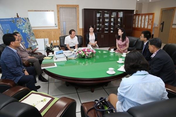 [짱시아오메이 광주 부총영사(오른쪽에서 세 번째)가 20일 신안군을 방문해 고길호 군수 및 관계자들과 환담을 나누고 있다.]<br />