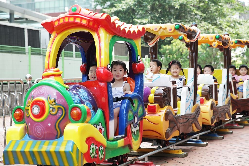 어린이들이 ‘마리오 꼬마기차’를 타며 즐거워하고 있다. 마리오아울렛은 오는 8월 31일까지 주말 및 공휴일에 마리오아울렛 야외공간에서 어린이를 위한 꼬마기차를 무료 운행한다.