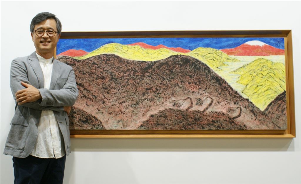 이종승 작가가 다음달 14일까지 서울 강남구 삼성동 대웅제약 본사에 있는 대웅 아트스페이스에서 열리는 개인전에 전시된 자신의 작품 앞에서 기념촬영을 하고있다. <br />