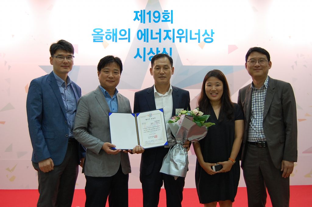 동양매직의 송재민 이사(가운데)와 직원들이 수상 후 기념촬영을 하고 있다.