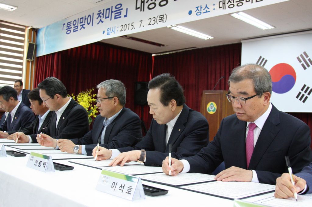 청호나이스 이석호 대표(오른쪽 첫번째)가 23일 대성동 마을에서 진행된 '대성동 프로젝트' 업무협약서에 서명하고 있다.