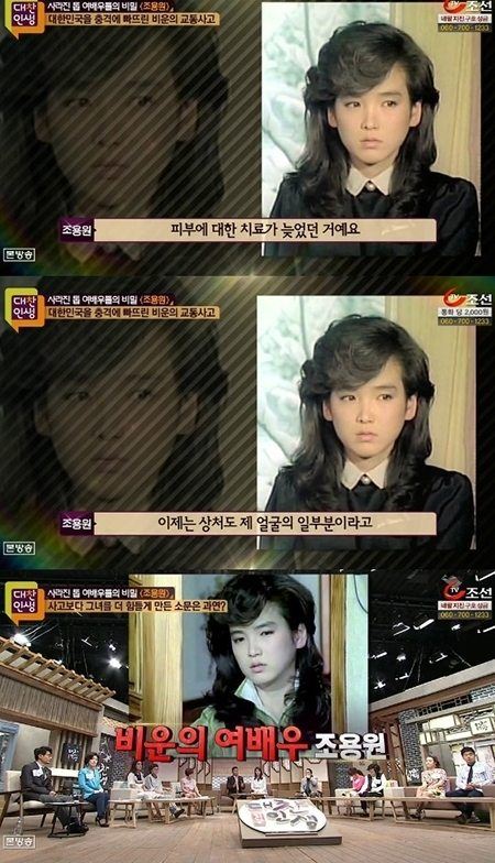 [아시아경제 온라인이슈팀]'비운의 여배우' 조용원이 화제다.지난 5월 방송된 종합편성채널 TV조선 '대찬인생'에서는 80년대를 풍미하며 눈부신 활약을 펼쳤으나 대중의 기억 속으로 사라져버린 조용원의 파란만장한 삶과 근황을 전했다.이날 패널들은 조용원 인생 중 최대의 위기였던 교통사고 사건을 다루며 "잘 나가던 여배우에게 벌어진 비극이었다"며 안타까움을 드러냈다.당시 조수석에 앉아 있던 조용원은 트럭과 정면충돌 후 밖으로 튕겨나가 전치 10주의 부상을 입게 됐다. 이에 여배우로서 치명타인 얼굴에 큰 상처를 얻게 된 것으로 알려졌다.이날 방송에서는 그 당시 사고에 대한 심정이 담긴 조용원의 음성이 공개됐다. 조용원은 교통사고를 언급하며 "그 당시에는 몸을 많이 다쳤기 때문에 얼굴 다친 것은 신경을 쓸 수 없었다"며 말문을 열었다.조용원은 "그래서 현재 회복 불가능한 상태다"라고 밝혀 안타까움을 자아냈다.한편 조용원은 이후 그는 재기하려고 노력했지만 끝내 '불운의 배우'로 각인되며 일본으로 유학을 떠난 것으로 알려졌다.온라인이슈팀 issue@asiae.co.kr<ⓒ세계를 보는 창 경제를 보는 눈, 아시아경제(www.asiae.co.kr) 무단전재 배포금지>