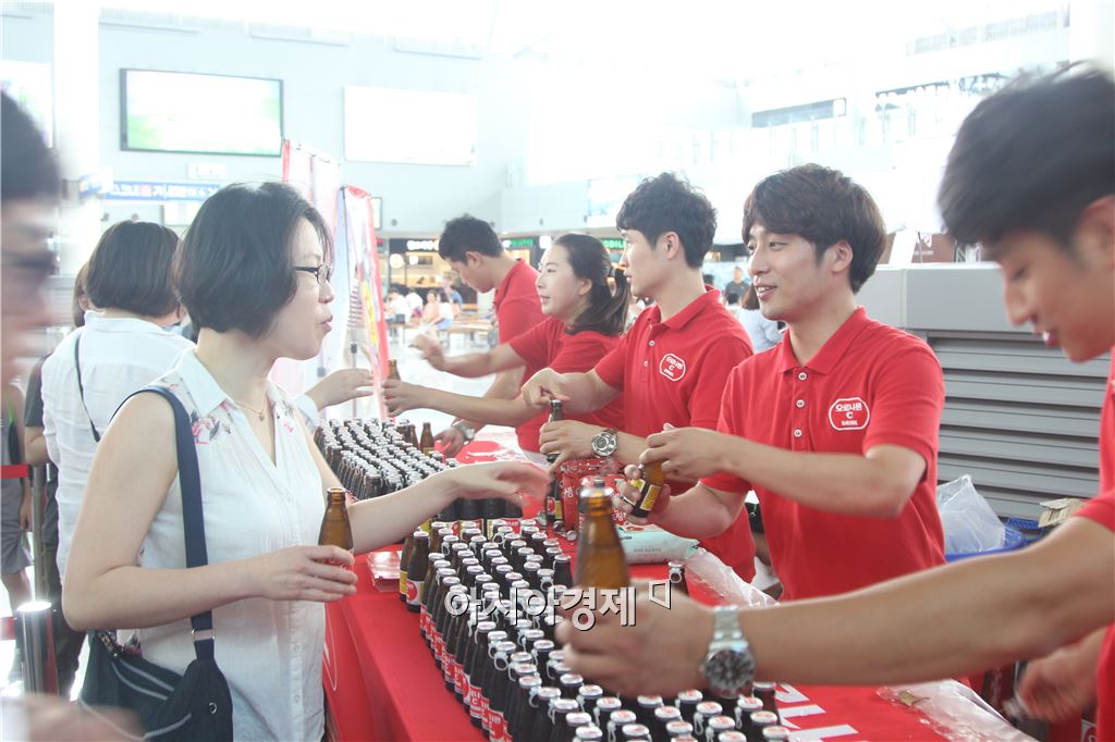 동아오츠카가 지난 주말(25∼26)일 부산역에서 '생기발랄 탄산드링크 오로라민C'를 제공하는 무료 시음회를 열었다. 임직원들이 시민들에게 오로나민C를 제공하고 있다.