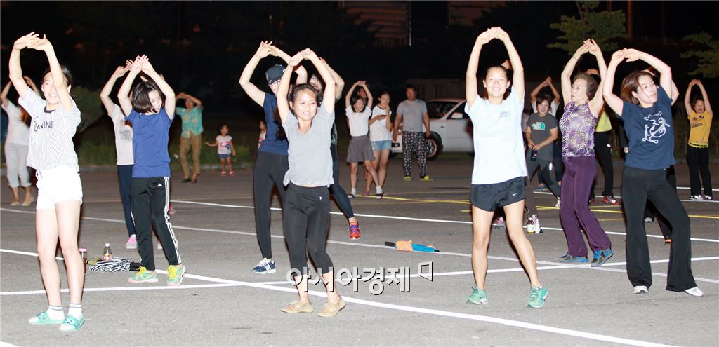 "황소주차장에서 7~8월 매주 월~금요일 저녁 8시부터 1시간 동안 열어"[아시아경제 노해섭 기자]불볕더위와 열대야가 지속되고 있는 가운데 이열치열로 운동하면서 무더위를 이겨내려는 사람들이 늘어나고 있다. 지난 27일 밤 전남 함평군 함평읍 함평엑스포공원 황소주차장에서 주민 100여 명이 강사의 율동을 따라하면서 무더위 물리치고 있다. 함평군생활체육회(회장 김형모)가 주관하는 이 건강체조 교실은 7~8월 매주 월~금요일 저녁 8시부터 1시간 동안 열린다. 1명의 강사가 신나는 음악과 함께 누구나 쉽고 즐겁게 따라할 수 있는 에어로빅과 스트레칭을 지도해 큰 인기를 끌고 있다.전남 함평군 함평읍 함평엑스포공원 황소주차장에서 주민 100여 명이 강사의 율동을 따라하면서 무더위 물리치고 있다. 사진제공=함평군<br />