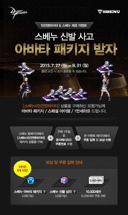 넥슨, 스베누와 제휴 이벤트 진행스베누에서 신발 사면 던전앤파이터 아이템 준다[아시아경제 안하늘 기자] 넥슨은 의류 브랜드 스베누와 제휴를 맺고 온라인 액션게임 '던전앤파이터'에서 이벤트를 실시한다고 29일 밝혔다.넥슨은 스베누 공식 온라인 스토어(www.sbenu.co.kr) 내 'E-SHOP'에서 '던파 X 스플래시' 신발 상품을 구매한 고객에게 던전앤파이터 아이템 패키지를 지급한다.아이템 패키지는 1만 세라, 스베누 고스로리 아바타 9부위, 순수한 황금 증폭서, 클론 레어 아바타 풀세트 상자 등을 무작위로 획득할 수 있는 '스베누 선물상자'로 구성됐다.스베누는 아이유, AOA 등 인기 스타를 모델로 앞세워 빠르게 성장하고 있는 의류 브랜드다. e스포츠 등 게임 산업과 활발한 제휴로 게이머에게도 인지도가 높다. 제휴 이벤트는 다음달 31일까지 열리며 자세한 내용은 던전앤파이터 공식 홈페이지(//df.nexon.com)에서 확인할 수 있다.2005년부터 서비스돼 오는 8월 10주년을 맞는 던전앤파이터는 넥슨의 자회사 네오플이 개발한 온라인 액션게임이다. 전세계 4억 명의 이용자를 보유하고 있고, 국내에서 최고 동시접속자수 29만 명을 기록하는 등 많은 사랑을 받고 있다.안하늘 기자 ahn708@asiae.co.kr<ⓒ세계를 보는 창 경제를 보는 눈, 아시아경제(www.asiae.co.kr) 무단전재 배포금지>