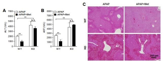 ▲GADD45β 유전자 결핍 생쥐와 정상 생쥐에서 아세트아미노펜에 의한 간독성 비교 결과.[사진제공=한국연구재단]<br />