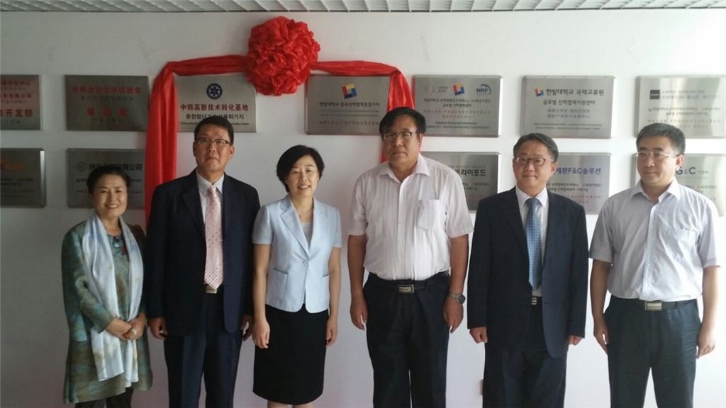 한밭대학교 산학협력선도대학육성사업단 관계자 등이 31일 중국 탕산(唐山, Tangshan) 중한첨단기술상용화기지에서 ‘한밭대 가족회사 중국사무소 설립 현판식’을 갖고 기념사진을 찍고 있다.