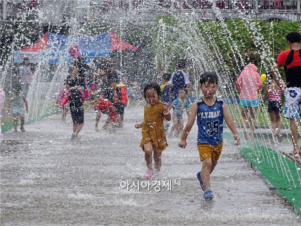 연일 30℃를 웃도는 찜통더위가 기승을 부리고 있는 가운데 31일 제8회 정남진 장흥 물축제가 열리고 장흥군 탐진강변에 전국에서 수많은 관광객들이 찾아왔다. 이날 분수 터널을 찾은 어린이들이 시원한 물줄기를 맞으면서 한여름 무더위를 식히고 있다. <br /> <br /> 장흥물축제는 7월 31일부터 8월 6일까지 탐진강과 우드랜드 일원에서는 ‘물과 숲 - 休’의 주제로 제8회 정남진 장흥 물축제가 개최된다.<br />