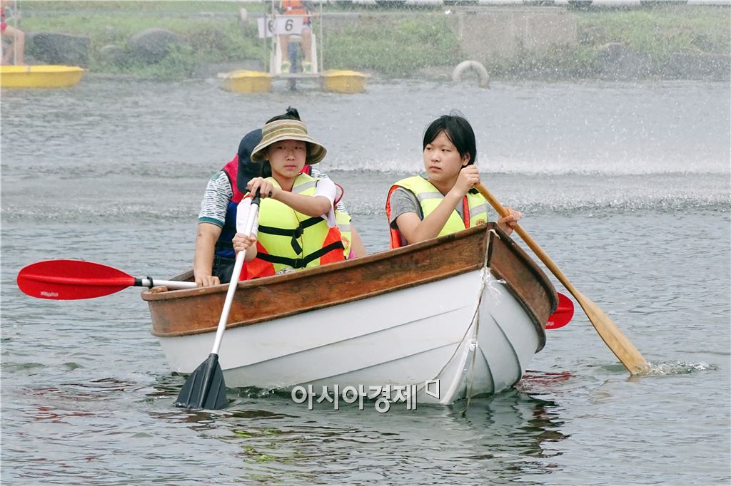 연일 30℃를 웃도는 찜통더위가 기승을 부리고 있는 가운데 31일 제8회 정남진 장흥 물축제가 열리고 장흥군 탐진강변에 전국에서 수많은 관광객들이 찾아왔다. 정남진 물축제장을 찾은 피서객들이 보트를 타고 한여름 무더위를 식히고 있다. <br /> <br /> 장흥물축제는 7월 31일부터 8월 6일까지 탐진강과 우드랜드 일원에서는 ‘물과 숲 - 休’의 주제로 제8회 정남진 장흥 물축제가 개최된다.<br />