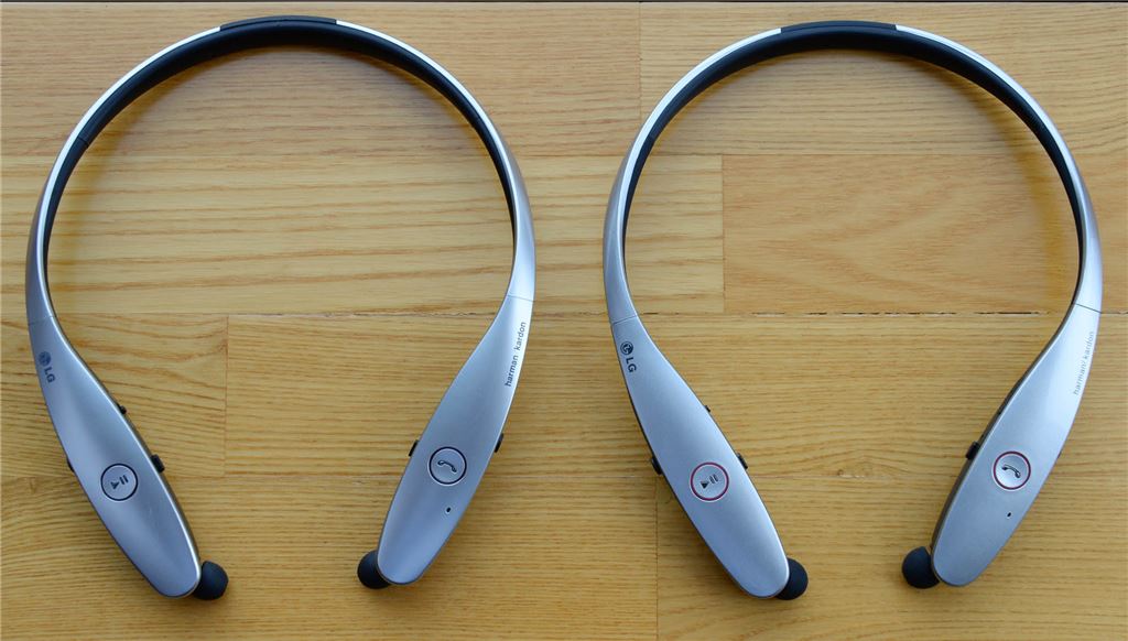 구분하기 정도로 유사한 톤플러스 정품(오른쪽, 모델명: HBS-900)과 톤플러스 모조품(왼쪽). 자세히 보면 정품은 통화, 재생버튼 주위가 투명하지만 모조품은 붉은색으로 보인다.(사진=LG전자)