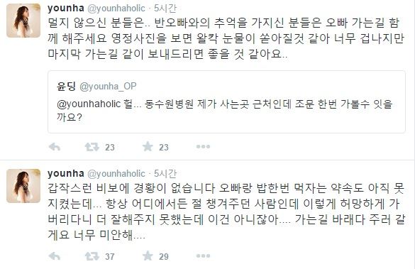 [아시아경제 온라인이슈팀] 가수 윤하가 브로큰발렌타인의 멤버 반의 사망소식에 애도의 뜻을 표했다.윤하는 4일 자신의 트위터에 "갑작스런 비보에 경황이 없다. 오빠랑 밥 한번 먹자는 약속도 아직 못 지켰는데 항상 어디에서든 절 챙겨주던 사람인데 이렇게 허망하게 가버리다니. 더 잘해주지 못했는데 이건 아니잖아. 가는 길 바래다 주러가겠다. 너무 미안해"라며 브로큰발렌타인 반 사망을 애도했다.이어 "멀지 않으신 분들은. 반오빠와의 추억을 가지신 분들은 오빠 가는 길 함께 해달라"며 "영정사진을 보면 왈칵 눈물이 쏟아질 것 같아 너무 겁나지만 마지막 가는 길 같이 보내드리면 좋을 것 같다"고 당부했다.3일 브로큰발렌타인 측은 공식 페이스북을 통해 "갑작스럽게 너무도 가슴 아픈 소식을 전해드리게 됐다. 13년간 우리 곁을 함께했던 브로큰발렌타인의 보컬 반(김경민)이 갑작스러운 불의의 사고로 우리 곁을 떠났다"고 부고를 전했다.반이 보컬로 활동하고 있는 브로큰발렌타인은 지난 2002년 결성, 많은 마니아 팬층을 보유하고 있는 밴드다. KBS2 '톱밴드 시즌1'에 출연하기도 했다.브로큰발렌타인 반의 빈소는 동수원병원 장례식장 2호실에 마련됐다. 발인은 5일이다.온라인이슈팀 issue@asiae.co.kr<ⓒ세계를 보는 창 경제를 보는 눈, 아시아경제(www.asiae.co.kr) 무단전재 배포금지>