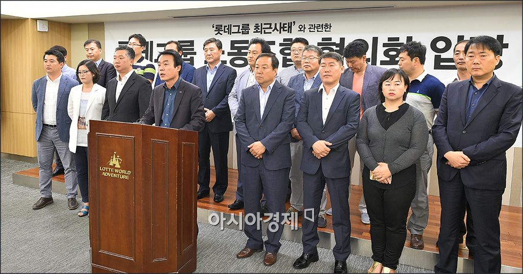 [아시아경제 윤동주 기자] 강석윤 롯데노동조합협의회 의장 등 롯데계열사 노동조합 위원장들은 5일 서울 송파구 잠실롯데월드에서 최근 '재벌가(家) 황제 경영 막장'을 보여주고 있는 롯데가(家) 신동빈, 신동주 형제간의 진흙탕 싸움에서 신동빈 롯데 회장을 지지하는 선언을 하고 있다.윤동주 기자 doso7@asiae.co.kr<ⓒ세계를 보는 창 경제를 보는 눈, 아시아경제(www.asiae.co.kr) 무단전재 배포금지>