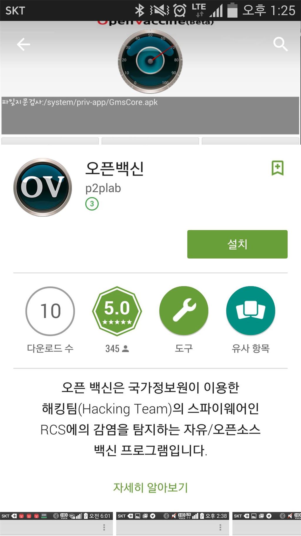 스스로 국정원의 RCS에 감염됐는지 여부를 파악하는 방법은 간단하다. 우선 구글스토어에서 '오픈 백신'을 검색해 이를 설치하면 된다. 간단한 동의 절차를 거쳐 오픈 백신 애플리케이션을 설치·실행하면 검사, 취소, 신고 버튼이 있는 초기화면이 나온다.
