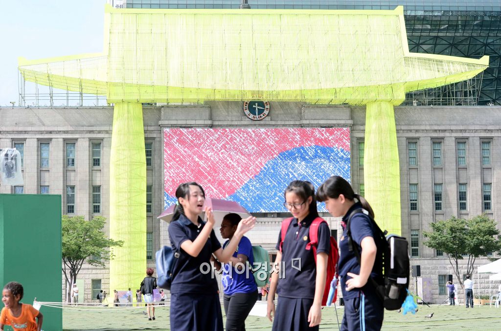 [아시아경제 최우창 기자] 광복 70주년을 맞아 서울도서관이 한옥 모습으로 변신했다.도서관 외벽 한가운데 설치된 태극문양 부분은 서울시민 5000여명이 광복에 대한 자신의 생각을 적은 텍스트로 꾸며졌다.10일 한옥으로 변신한 서울도서관 주변으로 시민들이 지나가고 있다.최우창 기자 smicer@asiae.co.kr<ⓒ세계를 보는 창 경제를 보는 눈, 아시아경제(www.asiae.co.kr) 무단전재 배포금지>
