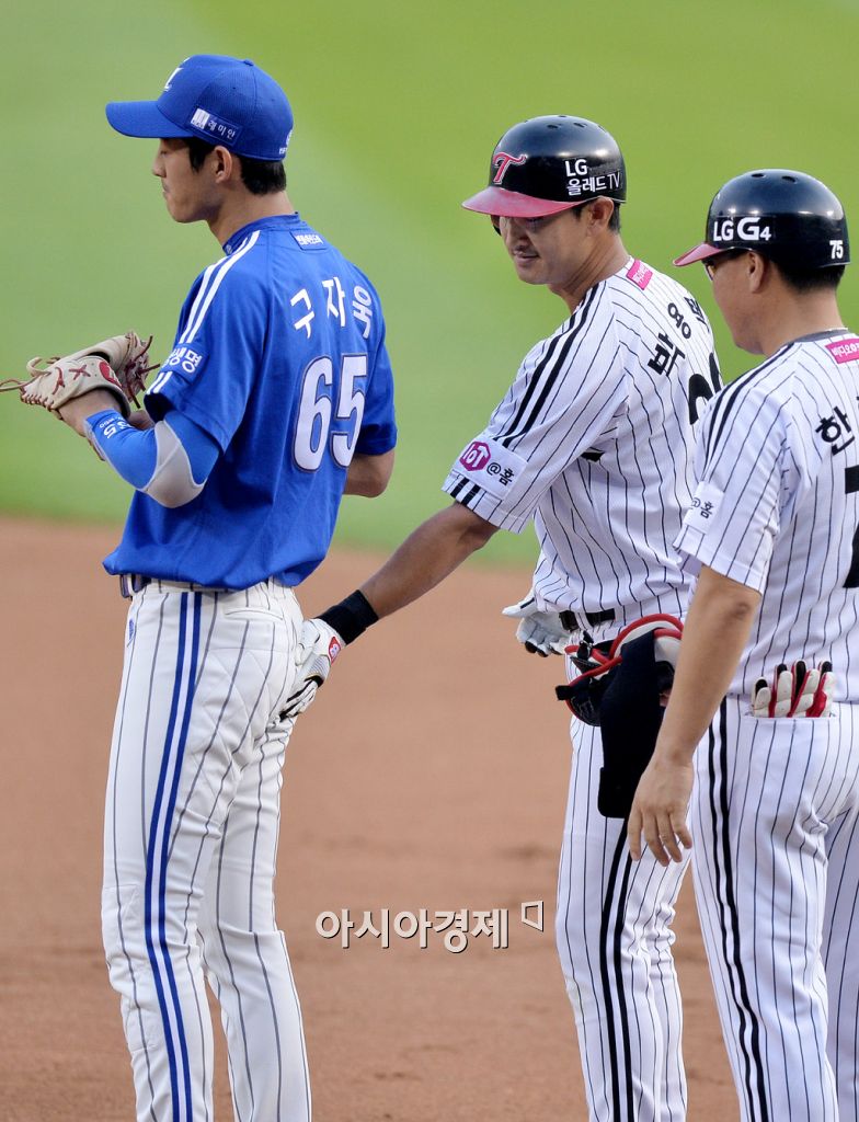 [잠실=아시아경제 김현민 기자] 2015 KBO리그 삼성 라이온즈와 LG 트윈스의 경기가 11일 잠실야구장에서 열렸다. 1회말 2사에서 LG 박용택이 좌전 안타를 치고 출루한 뒤 삼성 1루수 구자욱의 엉덩이를 두드리며 장난치고 있다. 김현민 기자 kimhyun81@asiae.co.kr<ⓒ세계를 보는 창 경제를 보는 눈, 아시아경제(www.asiae.co.kr) 무단전재 배포금지>
