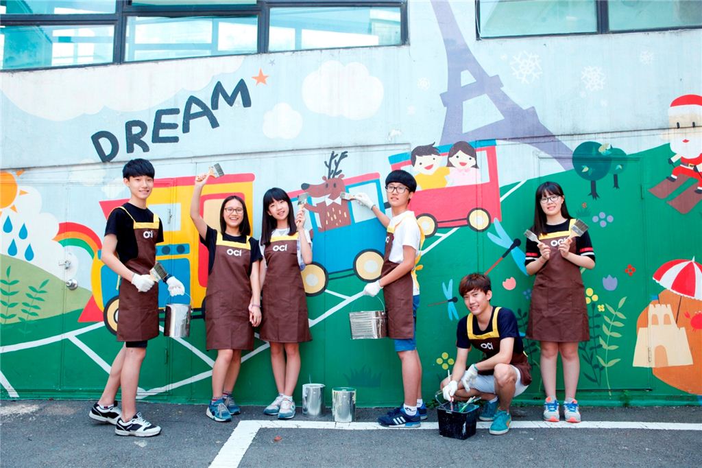 ▲OCI 임직원 자녀들이 12일 벽화봉사활동을 마치고 기념촬영을 하고 있다.