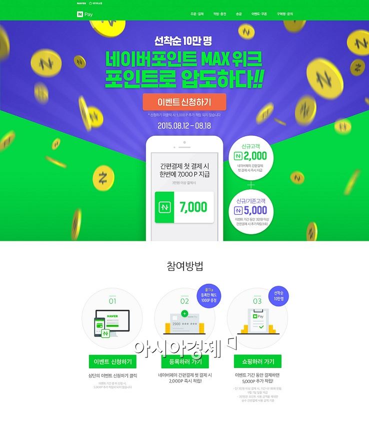 [아시아경제 한진주 기자] 네이버(NAVER)는 오는 18일까지 간편결제로 구매하는 고객에게 포인트를 지급하는 '네이버포인트 맥스(MAX) 위크' 이벤트를 연다.12일 네이버는 8월12일부터 18일까지 선착순 10만명을 대상으로, 실명 인증 기준으로 1회에 한해 3만원 이상 간편결제로 구입하면 7000포인트를 적립한다고 밝혔다. 신규 사용자가 최초로 간편결제를 이용하면 2000 포인트, 3만원 이상 간편결제를 할 때 5000 포인트를 추가로 적립 받을 수 있다. 기존 가입자의 경우 3만원 이상 간편결제를 이용하면 5000포인트가 적립된다. 네이버는 지난 6월 네이버페이 정식 출시에 맞춰 네이버 마일리지와 네이버 캐시를 '네이버포인트'로 통합했다. 네이버포인트는 현대백화점, 일룸, 영풍문고 등 5만7000여개의 네이버페이 가맹점과 N스토어, 네이버뮤직 등 네이버 서비스에서 현금과 동일하게 사용할 수 있다. 네이버페이 간편결제를 이용하면 이벤트 기간이 아니어도 결제 금액의 3%를 네이버포인트로 적립받을 수 있다.최진우 네이버페이 셀장은 "결제, 충전, 송금까지 한 번에 가능한 네이버페이의 경우 범용성과 편의성이 높아서 한 번 경험하면 꾸준히 사용하는 이용자가 많다"며 "향후 추석 연휴 이벤트 등 신규 가입자와 기존 이용자 모두에게 실질적인 혜택을 제공하는 다양한 이벤트를 준비하겠다"고 말했다. 한진주 기자 truepearl@asiae.co.kr<ⓒ세계를 보는 창 경제를 보는 눈, 아시아경제(www.asiae.co.kr) 무단전재 배포금지>