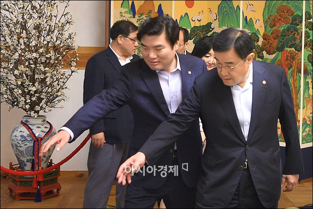 [아시아경제 윤동주 기자] 16일 서울 여의도 국회에서 열린 당정청 정책조정협의회에 참석한 원유철 새누리당 원내대표(왼쪽)와 김정훈 정책위의장이 자리에 앉기 위해 손을 뻗고 있다.윤동주 기자 doso7@asiae.co.kr<ⓒ세계를 보는 창 경제를 보는 눈, 아시아경제(www.asiae.co.kr) 무단전재 배포금지>