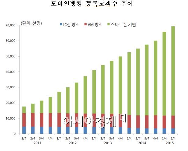 [아시아경제 구채은 기자] 스마트폰뱅킹의 등록고객 수가 5800만명에 육박했다.한국은행이 17일 발표한 '2분기 국내 인터넷 뱅킹 서비스 이용현황'에 따르면 지난 6월말 현재 스마트폰 기반의 모바일뱅킹 등록고객 수는 5752만명으로, 3개월 전보다 6.8%(365만명) 증가했다.이는 국내 17개 시중은행, HSBC, 우체국 고객의 스마트폰뱅킹 등록자를 합한 것으로, 한 사람이 여러 은행에 가입한 경우엔 중복 계산됐다. 모바일뱅킹을 포함한 전체 인터넷뱅킹 등록고객은 1억1327만명으로, 3개월 전보다 4.3% 늘었다. 인터넷뱅킹 이용 중 조회서비스 이용건수는 7025만건으로 전분기보다 0.1% 늘었다. 특히 대출신청 이용실적은 484억원으로 전분기보다 38.8%나 증가했다. 한은 관계자는 "모바일 전용 중금리 대출상품 출시에 따른 신청절차 간소화와 일부은행의 대출한도 증액에 기인한 것"이라고 설명했다. 2분기 중 인터넷뱅킹 거래건수는 하루평균 7725만건으로 3개월 전보다 0.4% 늘었고 일평균 거래액(40조4627억원)은 7.7% 늘었다. 특히 이 가운데 스마트폰 뱅킹 거래는 4101만건, 2조3930억원으로 각각 2.2%와 8.3% 증가했다. 이에 따라 전체 인터넷뱅킹 등록고객 중 스마트폰뱅킹의 비중은 61.2%에 달했다. 6월 중 은행의 입출금·자금이체 처리 건수 가운데 인터넷뱅킹의 비중은 37.1%로 자동화기기(CD,ATM)의 39.4%에 이어 두 번째로 높았다. 텔레뱅킹은 12.2%, 창구거래는 11.2%였다.조회서비스 기준으로는 인터넷뱅킹의 업무처리 비중이 76.6%로 가장 크고 창구거래(15.2%), 텔레뱅킹(4.3%), 자동화기기(3.8%) 순이다.구채은 기자 faktum@asiae.co.kr<ⓒ세계를 보는 창 경제를 보는 눈, 아시아경제(www.asiae.co.kr) 무단전재 배포금지>