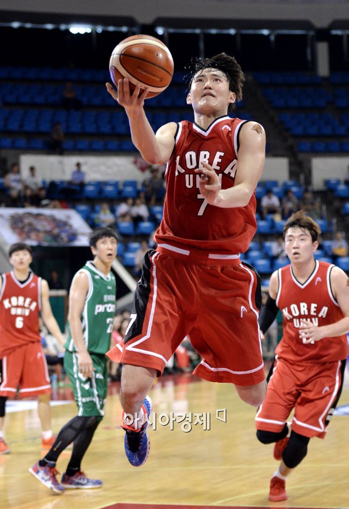 [잠실=아시아경제 김현민 기자] 2015 KCC 프로-아마 최강전 원주 동부와 고려대학교의 경기가 17일 잠실학생체육관에서 열렸다. 고려대 이동엽이 상대 수비를 뚫고 슛하고 있다. 김현민 기자 kimhyun81@asiae.co.kr<ⓒ세계를 보는 창 경제를 보는 눈, 아시아경제(www.asiae.co.kr) 무단전재 배포금지>