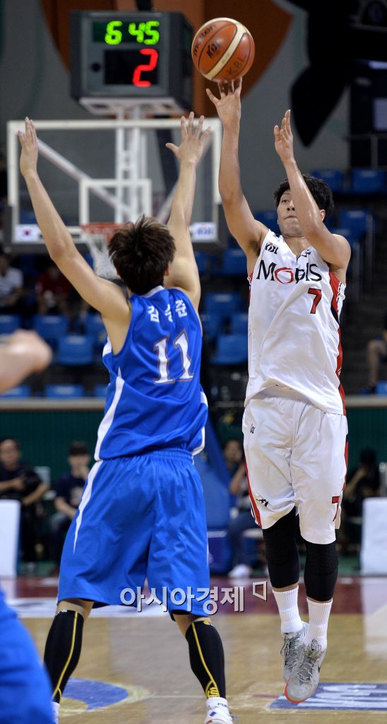 [잠실=아시아경제 김현민 기자] 2015 KCC 프로-아마 최강전 울산 모비스와 동국대학교의 경기가 17일 잠실학생체육관에서 열렸다. 모비스 송창용이 상대 김승준의 수비를 뚫고 슛하고 있다. 김현민 기자 kimhyun81@asiae.co.kr<ⓒ세계를 보는 창 경제를 보는 눈, 아시아경제(www.asiae.co.kr) 무단전재 배포금지>