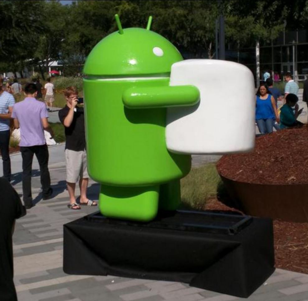 ▲구글 본사 정원에서 마쉬멜로우 모형을 들고 있는 안드로이드 마스코트(출처:폰아레나)