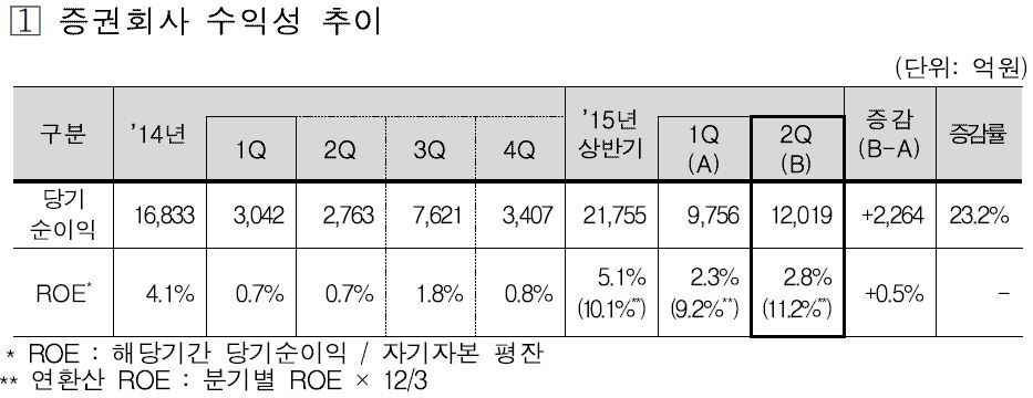[아시아경제 김혜원 기자] 국내 56개 증권회사의 지난 2·4분기 당기순이익이 8년 만에 분기 최대치를 기록했다.19일 금융감독원에 따르면 증권사의 2분기 당기순이익은 1조2019억원으로 전분기 대비 23.2%(2264억원) 증가했다. 이는 2007년 2분기(1조2806억원) 이후 분기 기준 최대 실적이다. 2분기 중 증권사의 자기자본순이익률(ROE)은 2.8%로 전분기 대비 0.5%포인트 상승했다.조국환 금감원 금융투자감독국장은 "증권사의 2분기 당기순이익이 8년 만에 최대치를 기록해 2008년 금융위기 이전 수준을 회복했다"며 "이는 주식시장 거래 활성화에 따른 위탁매매 수입 증대와 자기매매를 통한 운용 수익에 기인한 것"이라고 밝혔다.주요 항목별로 수탁수수료 수익은 1조3696억원으로 전분기 대비 36.5%(3660억원) 늘었다. 자기매매 이익은 1조2640억원으로 전분기와 비교해 13.1%(1899억원) 감소했지만 여전히 전체 이익기여도는 높았다. 국고채 금리 소폭 상승 등 채권 운용 환경 악화로 채권 관련 이익은 1조2033억원 감소한 8311억원을 기록한 반면 주식시장 활황에 따라 주식 관련 이익은 2002억원 늘었다.판매관리비는 2조567억원으로 전분기와 유사한 수준을 유지했다. 6월 말 현재 점포 수는 1261개, 인원은 3만608명이었다.전체 56개 증권사 중 49개사는 흑자(1조2170억원)를 기록한 반면 7개사는 적자(-150억원)를 시현했다. 전체 증권사의 자산총액은 366조3000억원으로 3월 말(356조9000억원)에 비해 9조4000억원 늘었다. 유가증권 잔액이 6조원 증가한 225조1000억원이며, 이 가운데 채권 잔액은 174조4000억원으로 집계됐다.부채총액은 322조7000억원으로 3월 말(314조3000억원) 대비 8조4000억원 증가했다. 자기자본은 43조6000억원으로 3개월 전보다 1조원 늘었다.증권사 주요 손익 항목별 추이[자료:금융감독원]