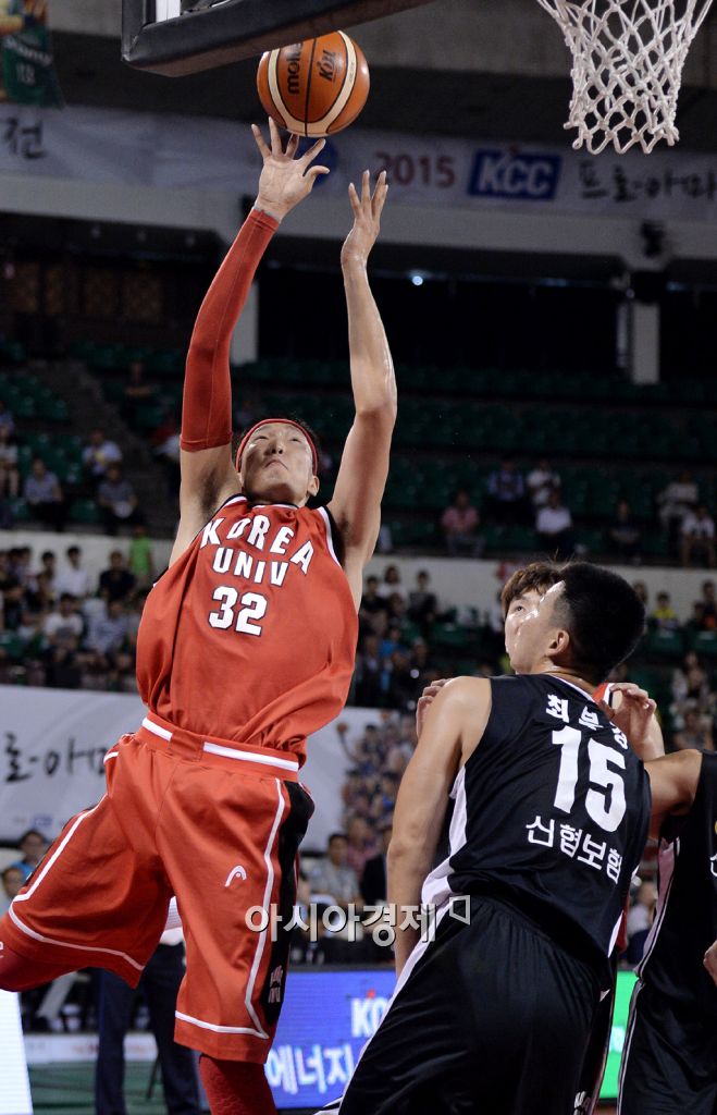 [잠실=아시아경제 김현민 기자] 2015 KCC 프로-아마 최강전 상무와 고려대학교의 경기가 19일 잠실학생체육관에서 열렸다. 고려대 이종현이 상무 최부경의 수비를 뚫고 슛하고 있다. 김현민 기자 kimhyun81@asiae.co.kr<ⓒ세계를 보는 창 경제를 보는 눈, 아시아경제(www.asiae.co.kr) 무단전재 배포금지>