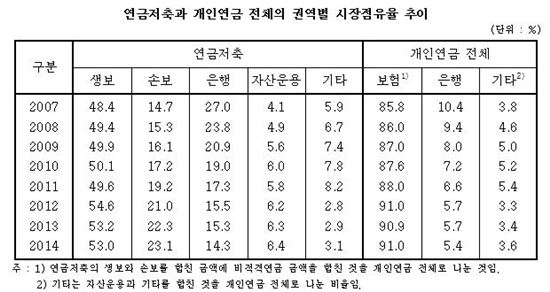 퇴직연금 점유율 7년새 50→32.5%로 낮아져..개인연금은 90% 넘어"퇴직연금, DC형 중점두고 종신연금 신화 버려야"[아시아경제 서지명 기자] 보험업계가 퇴직연금 시장에서는 역할이 축소되는 반면, 개인연금 시장에서는 선전하고 있는 것으로 나타났다. 손성동 미래에셋은퇴연구소 연금연구실장은 19일 열린 보험연합학술대회에서 '사적연금의 사회적 가치와 보험산업의 대응전략' 주제발표를 통해 이같이 밝혔다. 손 실장은 "지난 3월말 현재 퇴직연금 적립금이 107조7000억원으로 2008년 3월말 3조2000억원보다 33.7배 증가했다"고 설명했다. 업권별로는 희비가 엇갈렸다. 같은 기간 증권업계의 퇴직연금 적립금은 62배 늘어나 전체 업권 중에서 가장 큰 폭의 증가를 기록했다. 이어 은행권 41.1배, 손보업계 37.5배로 평균을 웃도는 증가폭을 기록했다. 반면 생보업계의 증가폭은 19.7배에 그쳐 다른 업권보다 매우 낮은 수준에 머물렀다. 업권별 시장점유율을 살펴보면 2008년 3월 기준 43.2%로 1위를 차지했던 생보업계의 시장점유율은 7년 만에 25.6%로 하락해 2위로 내려앉았다. 생보와 손보를 합친 보험권 전체의 퇴직연금 적립금 시장점유율은 2008년 3월 기준 50%를 조금 넘는 수준이었지만 지난 3월에는 32.5%로 크게 떨어졌다. 반면 은행권은 같은 기간 39.3%에서 49.6%로 10%포인트 이상 시장점유율을 높여 1위 자리로 올라섰다. 은행권의 시장점유율은 지난 2012년 말 이후 50% 전후로 확고부동한 1위를 점하고 있다. 증권업계는 10.2%에서 7%포인트 늘어난 17.2%로 여전히 3위를 기록했지만 4위인 손보업계와의 격차는 벌리면서 선전했다. 반면 개인연금 시장에서는 보험사가 승승장구하는 모습을 보였다.