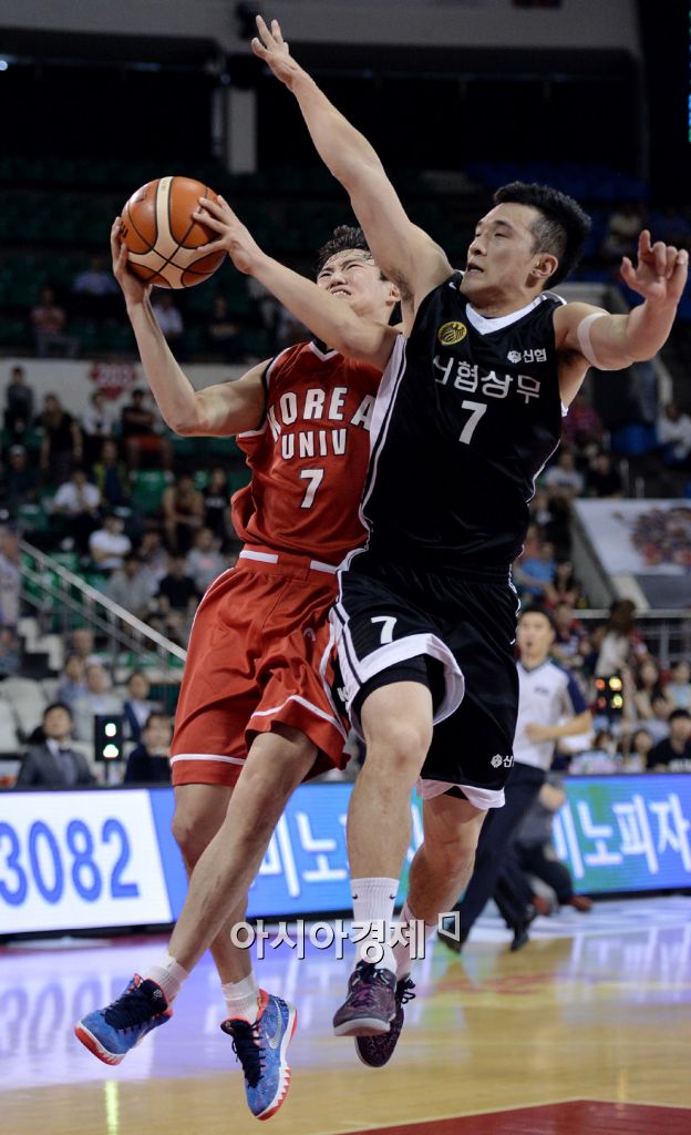 [잠실=아시아경제 김현민 기자] 2015 KCC 프로-아마 최강전 상무와 고려대학교의 경기가 19일 잠실학생체육관에서 열렸다. 고려대 이동엽이 상무 변기훈의 수비를 뚫고 슛하고 있다. 김현민 기자 kimhyun81@asiae.co.kr<ⓒ세계를 보는 창 경제를 보는 눈, 아시아경제(www.asiae.co.kr) 무단전재 배포금지>