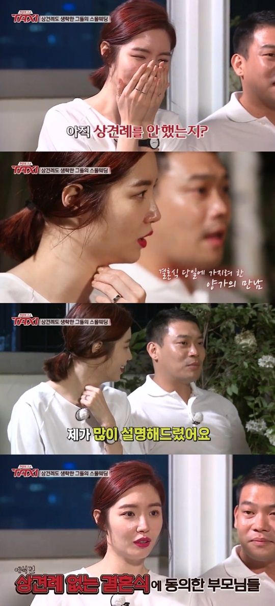 [아시아경제 온라인이슈팀] '택시' 김새롬 이찬오 부부가 상견례 없이 결혼식을 올려 눈길을 끌고 있다.18일 저녁 방송된 케이블TV tvN '현장토크쇼 택시'(이하 '택시')는 '로맨틱 택시 특집'으로 꾸며져 연애 4개월 만에 결혼에 골인한 김새롬, 이찬오 부부가 출연했다. 이날 이찬오 레스토랑의 야외 테라스를 찾은 오만석은 "부모님 모시고 와서 상견례도 여기서 하셨겠네요?"라고 묻자 김새롬은 "결혼식 날 상견례 겸 예식을 진행하려고 해요"라고 말했다. 녹화 날이 결혼을 하루 앞둔 날이었음에도 아직 양가 상견례도 하지 않았던 것. 이에 이영자는 "새봄 씨 부모님과 찬오 씨 부모님이 안 만났어요?"라고 당황해했고 이찬오는 "아직 안 만났어요"라고 답했다. 이영자가 다시 "일면식도 없어요?"라고 질문하자 이찬오는 "없어요"라고 강조했다.김새롬은 "저희가 시간이 없었던 것도 그렇지만, 어떻게 보면 사돈이라는 관계가 되게 먼 관계잖아요. 근데 괜히 저희 때문에 어떻게 보면 불편하실 수 있고, 서로 집도 다들 멀고 하다 보니까 그런 불편함을 최소화시켜드리는 게 좋겠다고 생각했어요"라고 설명했다. 이찬오는 "저는 새롬이 부모님을, 새롬이도 저희 부모님 뵈었어요"라며 "제가 많이 설명해드렸어요. 이러이러하신 분이라고. 그래서 제가 결혼식 때 뵈면 된다고"라고 덧붙였다.이영자는 다시 "그럼 부모님이 한 번에 오케이를 해요?"라고 물었고, 오만석은 "결혼식 때 보시겠대요?"라며 질문에 힘을 실었다. 그러자 이찬오는 "네"라고 답해 놀라게 했다.한편 이찬오와 김새롬은 지난 4월 지인의 소개로 만나 연인으로 발전했다. 이후 열애 4개월 만인 지난 13일 결혼했다. 당시 두 사람은 화려한 결혼식 대신 이찬오 셰프의 레스토랑에서 소박한 '스몰 웨딩'을 진행해 화제를 모은 바 있다.<center><div class="slide_frame"><input type="hidden" id="slideIframeId" value="2015072408283858765A">