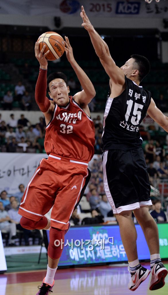 [잠실=아시아경제 김현민 기자] 2015 KCC 프로-아마 최강전 상무와 고려대학교의 경기가 19일 잠실학생체육관에서 열렸다. 고려대 이종현이 상무 최부경의 수비를 뚫고 슛하고 있다. 김현민 기자 kimhyun81@asiae.co.kr<ⓒ세계를 보는 창 경제를 보는 눈, 아시아경제(www.asiae.co.kr) 무단전재 배포금지>