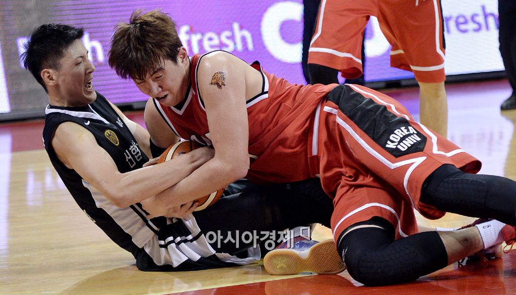 [잠실=아시아경제 김현민 기자] 2015 KCC 프로-아마 최강전 상무와 고려대학교의 경기가 19일 잠실학생체육관에서 열렸다. 고려대 강상재가 상무 최진수와 루즈볼을 다투고 있다. 김현민 기자 kimhyun81@asiae.co.kr<ⓒ세계를 보는 창 경제를 보는 눈, 아시아경제(www.asiae.co.kr) 무단전재 배포금지>