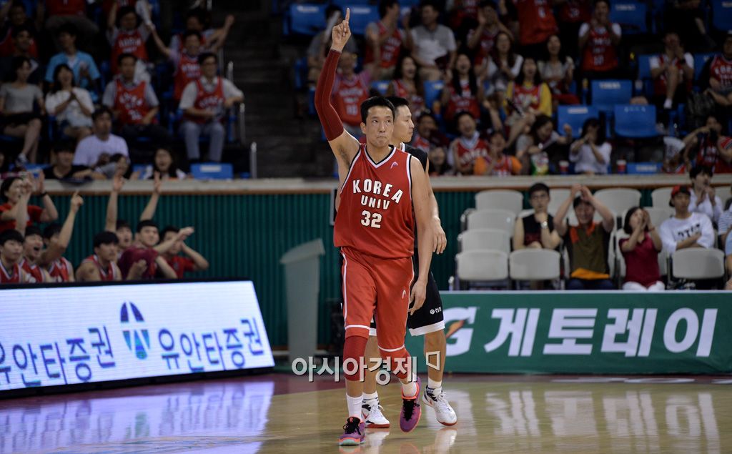 [잠실=아시아경제 김현민 기자] 2015 KCC 프로-아마 최강전 상무와 고려대학교의 경기가 19일 잠실학생체육관에서 열렸다. 고려대 이종현이 득점한 뒤 세리머니하고 있다. 김현민 기자 kimhyun81@asiae.co.kr<ⓒ세계를 보는 창 경제를 보는 눈, 아시아경제(www.asiae.co.kr) 무단전재 배포금지>