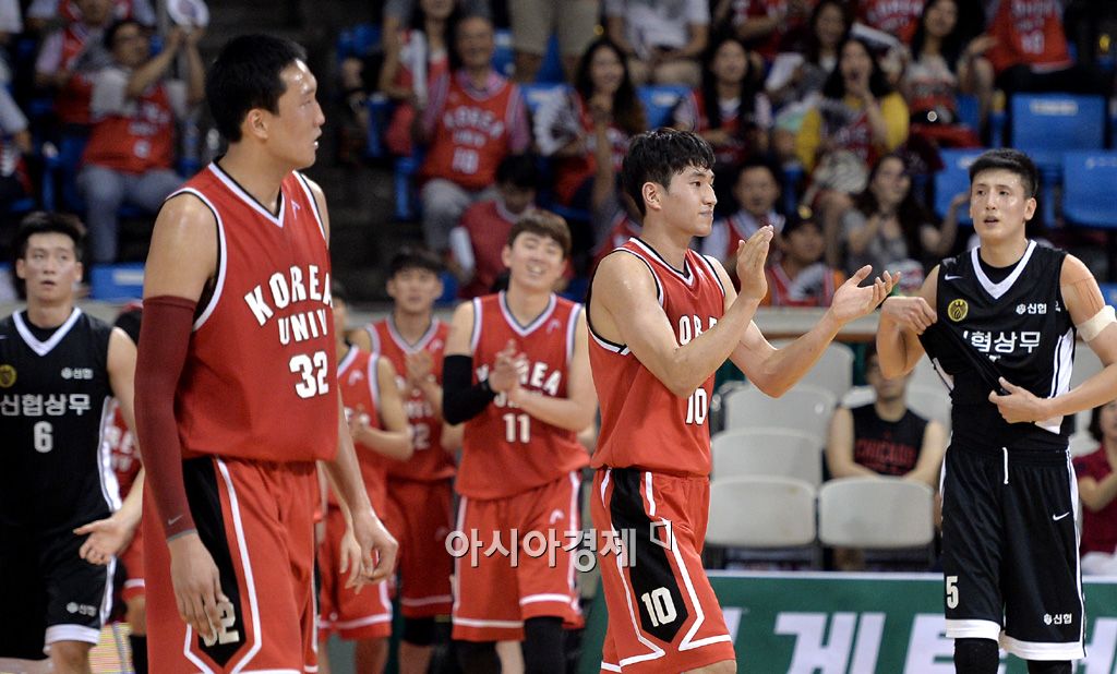 [잠실=아시아경제 김현민 기자] 고려대학교가 2015 KCC 프로-아마 최강전 상무와의 경기에서 79-64로 이겼다. 고려대 문성곤이 동료들과 박수를 치며 기뻐하고 있다. 김현민 기자 kimhyun81@asiae.co.kr<ⓒ세계를 보는 창 경제를 보는 눈, 아시아경제(www.asiae.co.kr) 무단전재 배포금지>