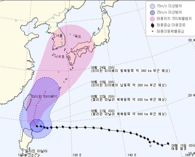 [아시아경제 온라인이슈팀] 제 15호 태풍 '고니'가 진로를 바꿔 한반도로 향할 것으로 보인다.21일 기상청은 "당초 대만을 지나 중국에 상륙할 것으로 예상됐던 제 15호 태풍 고니가 급회전, 한반도 쪽으로 북상하고 있다"며 "다음주 초반 한반도 부근까지 접근할 수 있을 것"이라고 내다봤다.20일 오후 3시 기준 타이완 타이베이 남남동쪽 약 760km 부근 해상에 있는 태풍 '고니'는 서쪽으로 이동해 21일 오후 3시쯤 타이베이 남남동쪽 약 620km부근 해상에 도착할 예정이다. 다음주 화요일인 25일과 수요일인 26일 사이에는 일본 규슈 북부를 지날 것으로 보인다.이로 인해 24일부터 남해안과 제주도에 비가 내리고 전라도, 충청도에는 25일 또는 26일까지 비가 계속될 것으로 보인다. 경상도는 25일까지 비가 오고 26일부터는 구름이 많이 끼겠다.한편 태풍 '고니'는 한국에서 제출한 이름으로 정해졌다.<center><div class="slide_frame"><input type="hidden" id="slideIframeId" value="2015071308473467323A">