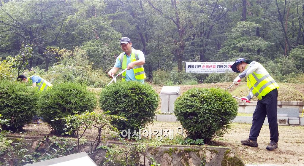 "산림조합중앙회 애국선열묘소에 재능기부 봉사활동 실시"[아시아경제 노해섭 기자]산림조합중앙회(회장 이석형)는 지난 20일 광복70주년을 기념하는 애국 행사의 일환으로 서울 성북구 북한산 자락에 위치한 ‘광복군합동묘소’와 초대부통령을 지낸 ‘성재 이시영 선생’의 묘소를 찾아 주변을 정비하는 재능봉사 활동을 펼쳤다. 이번 재능봉사 활동은 지난 8월 15일 광복70주년과 산림녹화70주년을 맞아 개최하였던 '815인 북한산 등반대회’에서 선열들의 뜻을 기리기 위한 북한산 지역에 위치한 묘역 참배 행사를 갖던 중 무성하게 자란 칡덩굴과 관리되지 않은 소나무로 인해 봉분에 그늘이 형성되어 잔디의 생육이 불량하고 주변 조경들에 대한 전문적인 관리의 필요성을 있음을 공감하고 산림조합중앙회 임업경제연구소(소장 이재현) 소속 연구원들이 자발적인 참여로 선열들의 묘소 주변 정비활동을 펼쳤다. 임업경제연구소 이재현 소장은 “애국심을 기반으로 헐벗은 민둥산을 녹화한 산림조합 선배들의 열정을 계승하고 조국광복을 위해 힘쓴 선열들을 기리는 뜻 깊은 광복70주년 맞이 애국보은 행사가 된 것 같다”며 “정기적으로 선열들의 묘역 관리를 위한 재능기부 봉사활동을 펼치겠다”고 말했다.노해섭 기자 nogary@<ⓒ세계를 보는 창 경제를 보는 눈, 아시아경제(www.asiae.co.kr) 무단전재 배포금지>