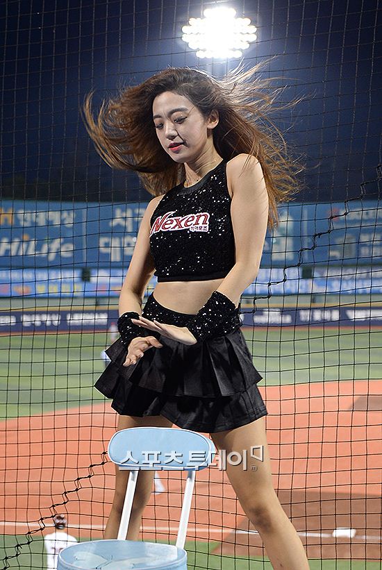 [아시아경제 온라인이슈팀] '2015 타이어뱅크 KBO리그' 넥센 히어로즈-SK 와이번스 프로야구 경기가 21일 오후 서울 양천구 목동 목동야구장에서 열렸다. 넥센 치어리더가 응원하고 있다.<center><div class="slide_frame"><input type="hidden" id="slideIframeId" value="2015070808574381007A">