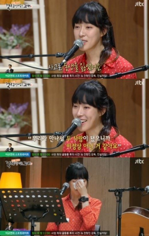 [아시아경제 온라인이슈팀] 가수 요조가 사망한 자신의 동생을 언급하며 눈물을 흘렸다.23일 방송된 JTBC '김제동의 톡투유-걱정 말아요 그대'(이하 '톡투유')에서는 방송인 알베르토 몬디, 사회과학자 최진기, 빅데이터 전문가 송길영, 가수 요조 등이 '비정상'을 주제로 400여 명의 청중과 대화를 나눴다.이날 '톡투유'에서는 한 서비스직 여성 사연자는 "손님을 응대할 때는 계속 웃는데 집에 가면 짜증을 낸다"며 "그게 무섭다, 친한 사람들한테도 연기를 하게 되는 것 같다"고 고민을 털어놨다. 이어 "아버지가 돌아가시고 매장에서 웃으면서 손님을 응대할 때 '내가 비정상인가' 생각했다"고 덧붙였다.또 그는 "내가 화를 내도 되는 친구, 가족들을 공격하게 되는데 매장에서는 어쩔 수 없이 웃어야 한다"며 "결국 자취를 선택했다"고 고백했다.그러자 요조도 자신의 사연을 언급했다. 그는 "사고로 동생을 잃었었는데 얼마 뒤에 제주도에서 공연이 있었다"며 "그때 저도 웃으면서 노래했는데 '내가 제정신인가' 생각했다"고 전했다.이어 "나 역시 애꿎은 가족들한테 화풀이를 하기도 했다, 자취를 결심하게 된 계기도 똑같다"며 "우리가 만나서 두 사람이 됐으니 비정상이 아닌 것 같다"고 공감해 시청자들의 안타까움을 자아냈다.한편 '톡투유'는 MC 김제동과 함께 하는 토크 콘서트로, 청춘과 가족, 친구 등 다양한 연령대의 청중들과 함께 서로의 고민과 걱정거리를 고민하고 소통하는 재미와 의미를 겸비한 프로그램이다. 매주 일요일 오후9시45분에 방송된다.온라인이슈팀 issue@asiae.co.kr<ⓒ세계를 보는 창 경제를 보는 눈, 아시아경제(www.asiae.co.kr) 무단전재 배포금지>