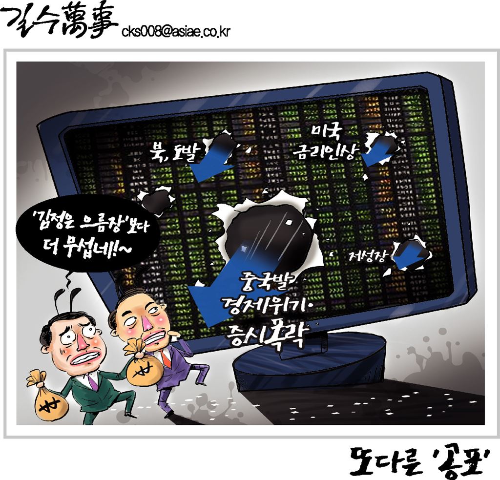 중국의 저성장과 상하이증시 폭락의 영향으로 한국증시 이탈이 가속화 되고 있습니다.외국인들은 '셀 코리아'로 돌아섰고, 국내 금융시장의 불안도 증폭되고 있는데요.북한의 도발과 중국발 쇼크로 한국경제는 말 그대로 첩첩산중 위기에 봉착했습니다.최길수 기자 cks008@asiae.co.kr<ⓒ세계를 보는 창 경제를 보는 눈, 아시아경제(www.asiae.co.kr) 무단전재 배포금지>
