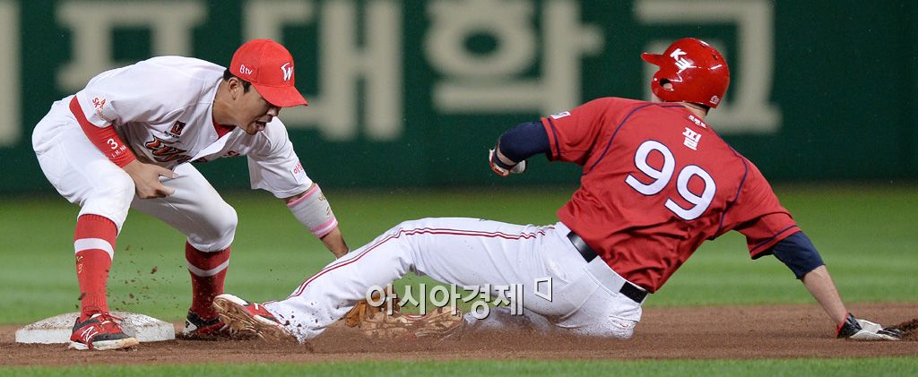 [인천=아시아경제 김현민 기자] 2015 KBO리그 KIA 타이거즈와 SK 와이번스의 경기가 25일 문학야구장에서 열렸다. 4회초 2사 1루에서 KIA 나지완 타석 때 1루주자 브렛 필이 SK 2루수 나주환에 태그아웃되고 있다. 김현민 기자 kimhyun81@asiae.co.kr<ⓒ세계를 보는 창 경제를 보는 눈, 아시아경제(www.asiae.co.kr) 무단전재 배포금지>