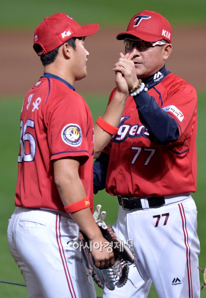 [인천=아시아경제 김현민 기자] 프로야구 KIA 타이거즈가 25일 인천 문학야구장에서 열린 2015 KBO리그 SK 와이번스와의 원정 경기에서 연장 승부 끝에 1-0으로 이겼다. KIA 김기태 감독이 고영우와 하이파이브하고 있다.김현민 기자 kimhyun81@asiae.co.kr<ⓒ세계를 보는 창 경제를 보는 눈, 아시아경제(www.asiae.co.kr) 무단전재 배포금지>