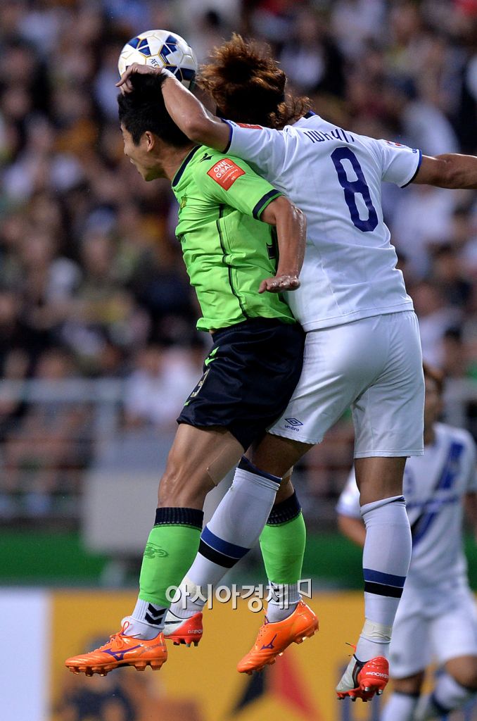 [전주=아시아경제 김현민 기자] 프로축구 전북 현대가 26일 전주월드컵경기장에서 감바 오사카(일본)와 AFC 챔피언스리그 8강 1차전을 했다. 전북 이근호가 상대 이와시타와 공중볼을 다투고 있다. 김현민 기자 kimhyun81@asiae.co.kr<ⓒ세계를 보는 창 경제를 보는 눈, 아시아경제(www.asiae.co.kr) 무단전재 배포금지>